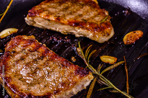 Roasted steaks with garlic, rosemary and spices in a cast iron grill pan