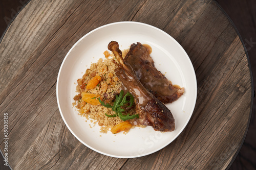 Roasted turkey and couscous on wooden table background