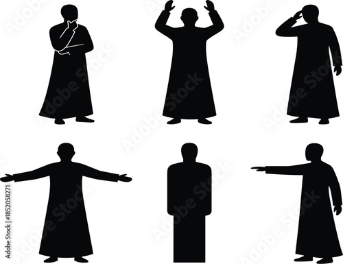 Robed figure, expressive gesture, silhouette illustration, black vector, dramatic pose, character icon, emotion, posture, cultural symbol, graphicRobed figure, expressive gesture