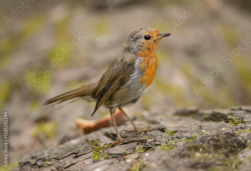 robin, redbreast, tree, trunk, perched, timberland, forest, front, side, rural, closeup, scotland, britain, britain, copy space, blurred background