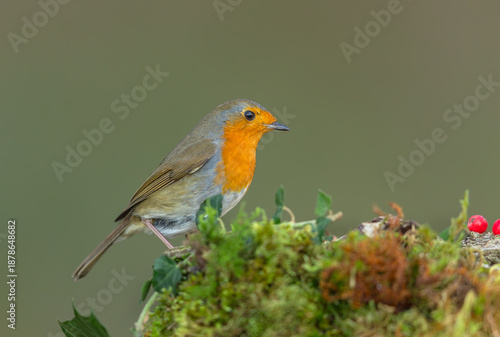 Robin Redbreast, Scientific name: Erithacus rubecula, in winter. Close up of a Robin Redbreast bird facing right with green moss and red berries. Clean background. Horizontal Copy space