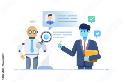 robot, businessman, candidate, profile, magnifying glass, analysis, review, recruitment, hiring, human resources, ai, artificial intelligence, technology, business, meeting, collaboration, datum, information, document, search, selection, evaluation, personnel, computer, illustration, vector, icon, graphic, digital, concept, teamwork, white background, isolated, career, employee, job, cv