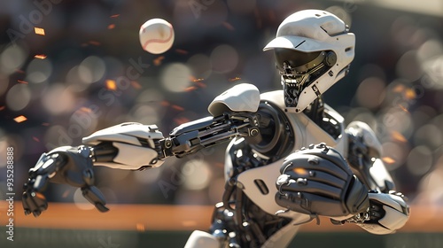 Robot Baseball Pitcher Throwing Ball: A robot pitcher winding up and throwing a fastball towards home plate.