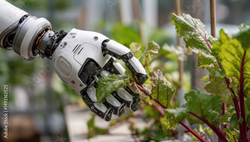 Robotic Arm Gently Holding Beet Greens in Garden, Symbolizing Automation and Sustainable Agriculture for a Greener Future : Generative AI