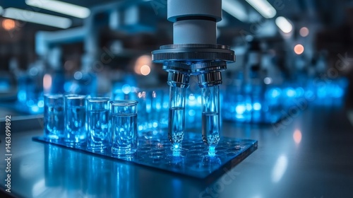robotic, arm, technology, automation, laboratory, research, test, tube, liquid, blue, light, science, equipment, machinery, manufacturing, precision, industrial, process, machine, modern, futuristic, closeup, experiment, medicals, digital, innovation, development, robotic, production, isolated, copy, space