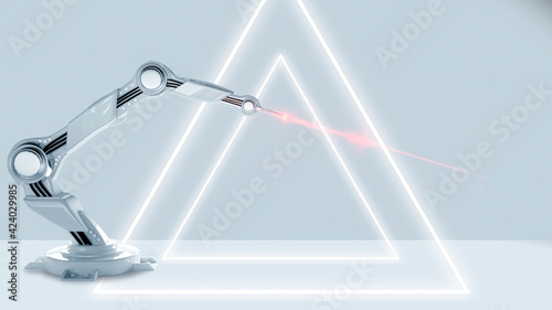 Robotic robot arm, industrial machine with laser beam. Futuristic light background with neon white light shapes. 3D illustration.