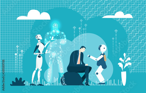 Robots vs humans. People communicating and developing robots. Robots helping people to solve problems, back up, nano technology, new era. Business concept illustration