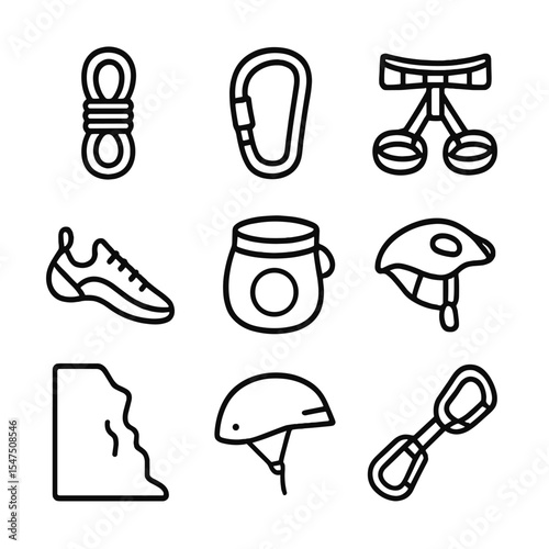 rock, climbing, icon, outline, icon, set, expedition, rope, snap-hook, harness, shoe, chalk, bag, belay, device, cliff, face, helmet, line