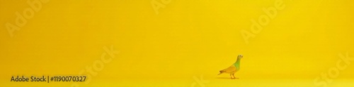 Rock dove standing over yellow background with open beak and surprised expression , bird's eye view, astonishment, landscape