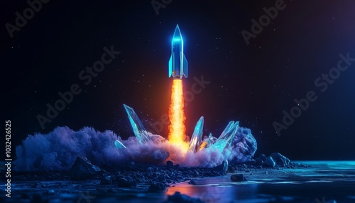 rocket, launch, startup, digital, start, business, up, polygon, datum, technology, blue, particle, space, abstract, ship, landing, background, banner, concept, design, island, ocean, flames, orange, bright, burning, rock, debris, trail, light, dark, horizon, tall, pointed, low angle, center, frame, distance, visible, trailing, body, colours, yellow, image