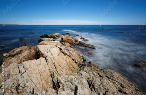 Rocks and slow motion ocean wave at Rye Harbor State Park, Portsmouth NH, USA. The park affords scenic views of the Atlantic Ocean, the Isles of Shoals, and Rye Harbor, also called Ragged Neck.