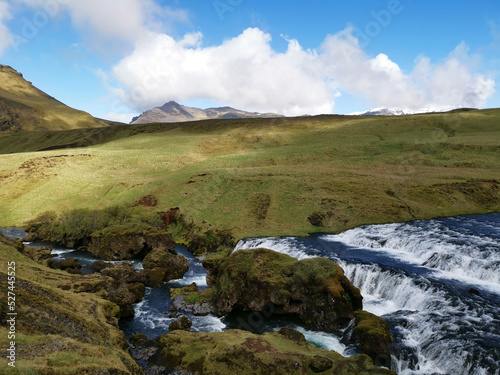Rocks in the river to the waterfall Skógafoss in iceland walkinga and hiking with idyllic blue sky on a road