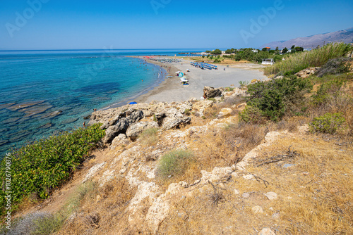 Rocky seaside beach with umbrellas and people, clear blue sky, sunny, Frangokastello, Greece, Crete island, wide angle lens