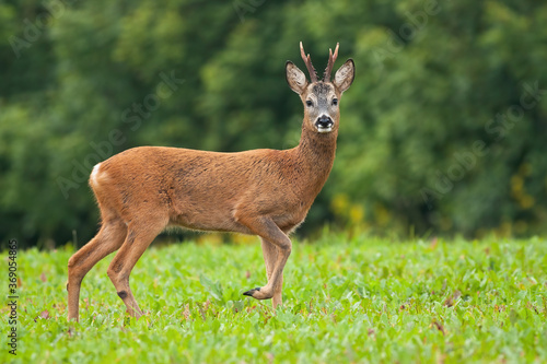 Roe deer, capreolus capreolus, male standing on meadow in summertime nature. Wild mammal walking from side view and looking to the camera on green field. Roebuck staring on glade.