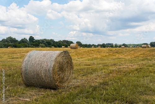 Roll of straw in an agricultural field with dry grass and blue skies with clouds in summer