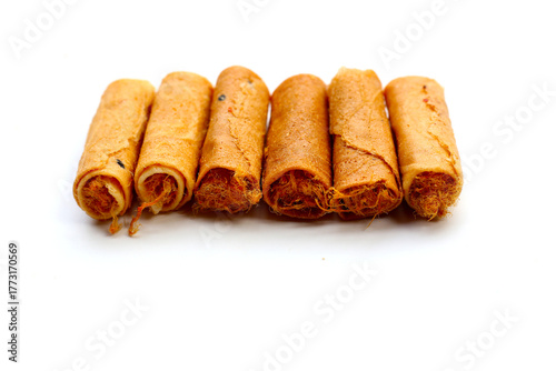 Rolled crispy wafers filled with shredded pork floss, Thai snack.