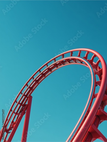 Roller Coaster Ascending: A vibrant red roller coaster track gracefully ascends against a brilliant blue sky. The image captures the thrill and excitement of amusement parks.