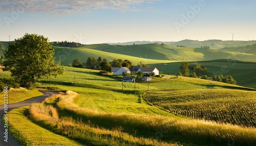 Rolling countryside hills with quiet roads, farmhouses, and tranquil rural charm in natural hues.