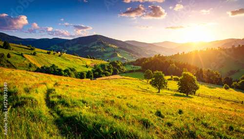 mountain, landscape, hill, sunset, field, serene, exploration, calmness, vista, warmth, peaceful, sunbeam, open, unspoiled, pristine, path, freedom, climb, tranquil, greenery, vibrant, rolling, ecological, breathtaking, light, idylli, pasture, gold, cloud, hillside, sun, farmland, highland, wilderness, sunlit, place, horizon, panorama, picturesque, hike, ascent, timberland, sky, sunlight, slope, meadow, tree, vacation