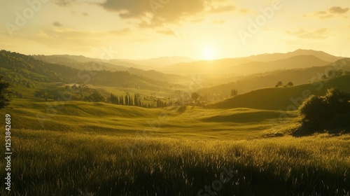 Rolling Green Hills of Tuscany Under Golden Hour Light for Travel and Landscape Photography
