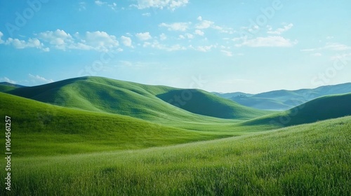 Rolling green hills with a clear blue sky, showcasing the simple beauty of open grasslands