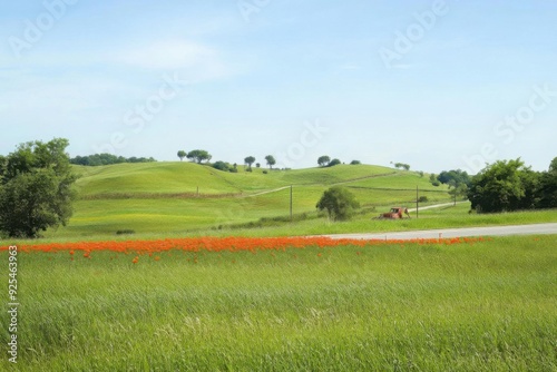 countryside, meadow, flower, hill, green, spring, road, field, nature, landscape, scenery, outdoors, clear, blue, sky, vegetation, tree, grass, serene, calm, peaceful, picturesque, horizon, poppy, wildflower, rural, sunny, day, natural, rustic, idylli, pastoral, country, fresh, scene, tranquil, bucolic, vista, field, farming