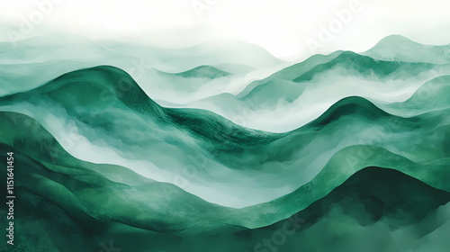 Rolling hills of emerald green grass on zephyr's gentle terrain, planet, water, clouds. Zephyrous. Illustration