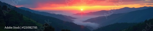 Rolling hills of misty mountains amidst a rainy sunset, rainy sunset, misty