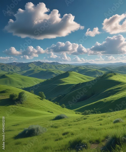 Rolling hills of vibrant green under a deep blue sky, fluffy clouds drifting lazily , day, hill, peaceful