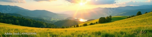 Rolling hills, sunlit meadows, distant mountains, view, illustration, design
