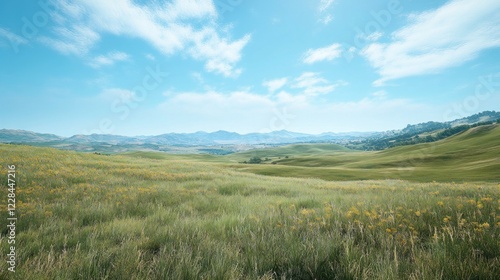 Rolling hills, wildflowers, sunny day, distant mountains, peaceful landscape