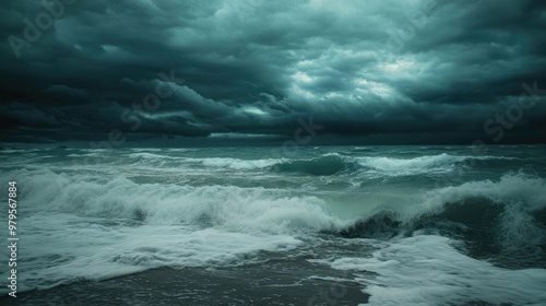 Rolling ocean waves on a stormy day, with dark, ominous clouds in the distance