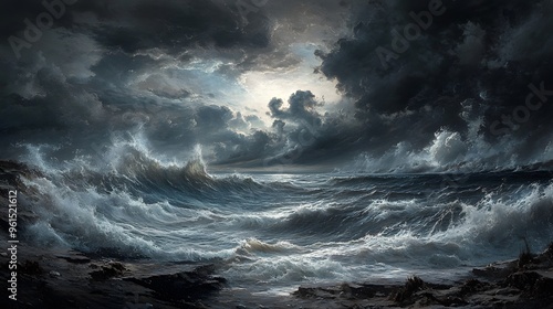 Rolling waves crashing against a rocky shoreline under a sky filled with dramatic clouds