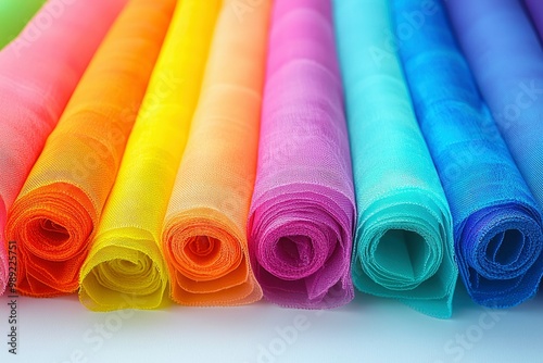 fabric, colourful, rainbow, hue, pink, red, orange, yellow, green, blue, purple, magenta, teal, turquoise, cyan, indigo, violet, lavandula, white, background, texture, textile, material, soft, smooth, delicate, bright, vibrant, pattern, mesh, net, sheer, semitransparent, rolled, folded, macro, abstract, design, craft, art, decor, decoration, party, celebration, event