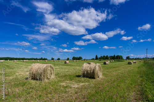 Rolls of rolled mown hay on a green summer meadow prepared for cattle