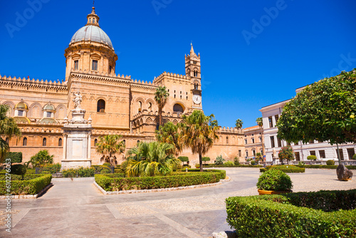palermo, italy, italian, sicilia, island, europa, capital, summer, day, sunlight, architecture, landmark, city, city landscape, tourist attraction, destination, famous place, tour tourism, travel, old, historical, historic, religion, statue, historical building, cathedral, church, catholic, unesco, holy place, roman, archdiocese, complex, facades, front, mediaeval, heritage, tower, clock, christian, mediterranean, binnenstad
