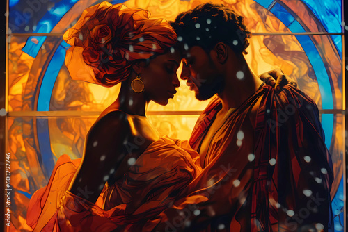 romance, fantasy, african, black, painting, lover, silhouette, illustration, novel, story, vintage, peasant, lady, rogue, secret, forbidden, ai, generative, sensual, sexy, young, 1800s, history, culture, art nouveau, style, woman, beauty, adventure, hero, hair, model, body, night, magic, couple, love, 2, kissing, dress, passion, together