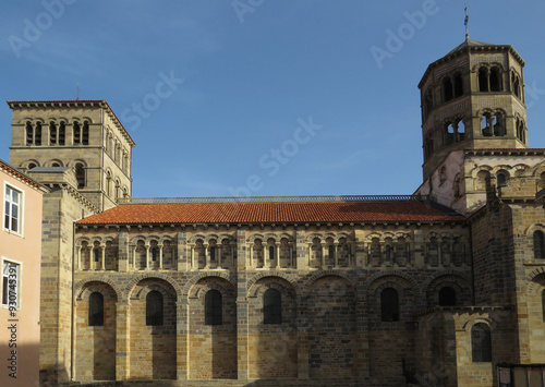 Romanesque Abbey of Saint-Austremoine. Issoire. 12 century. Auvergne. France. General view of the lateral south facade and bell tower.