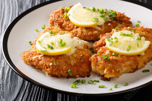 Romano cheese chicken cutlet fried breaded served with lemon and green onion closeup on a plate. horizontal
