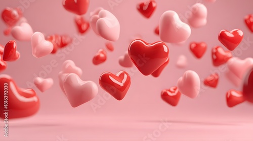 Romantic 3D red and pink hearts floating against a soft pink background for Valentines Day.