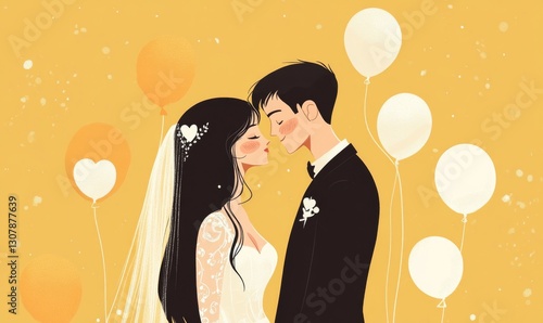 wedding, couple, anime, cartoon, illustration, bride, groom, romance, love, marriage, bridal gown, black hair, bang, white dress, balloon, line art, elegant, celebration, honeymooners, romantic, happiness, minimal, aesthetic, digital artwork, modern, stylised, hand-drawn, engagement, oneness, dreamy, ceremony, connection
