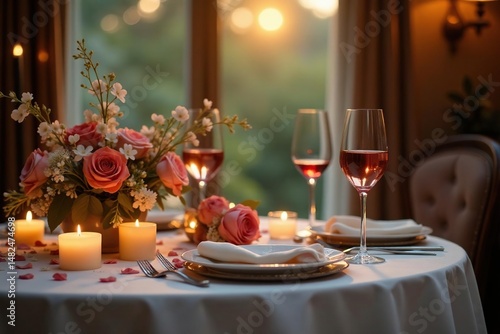 Romantic anniversary dinner setting, candles, flowers, wine , happy, night