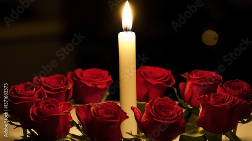 Romantic Arrangement of Red Roses and Candle with Soft Lighting