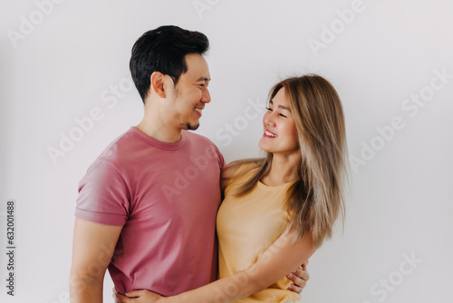 Romantic asian couple lover sweet hugging isolated on white.