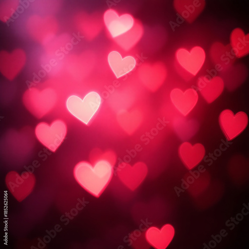 Romantic background with many glowing red and pink heart-shaped bokeh lights.