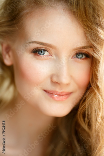 Romantic blonde. Young beautiful cute woman. Beauty girl with long shiny hair, glowing skin and voluminous haircut