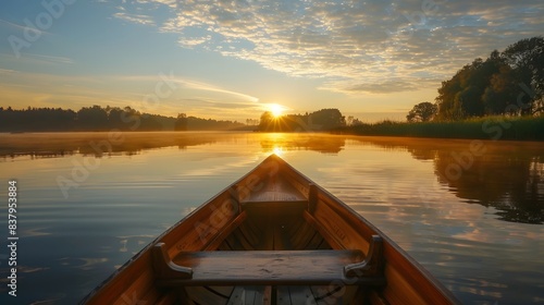 Romantic boat ride for two on a calm lake during sunrise, rowing, nature, tranquility, love