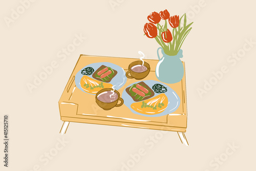 breakfast, flower, home, wooden, hot drink, delicious, food, fresh, healthy, meal, morning, plate, tasty, love, romance, nobody, concept, illustration