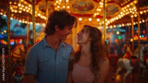Romantic carousel ride: Couple laughing and holding hands under magical carnival lights
