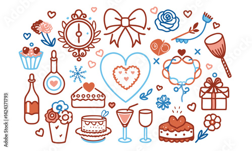Romantic Coquette Clipart Set – Hand-Drawn Birth Day, Valentine’s Day & Wedding Elements with Hearts, Ribbons, Roses, and Vintage Love Décor
